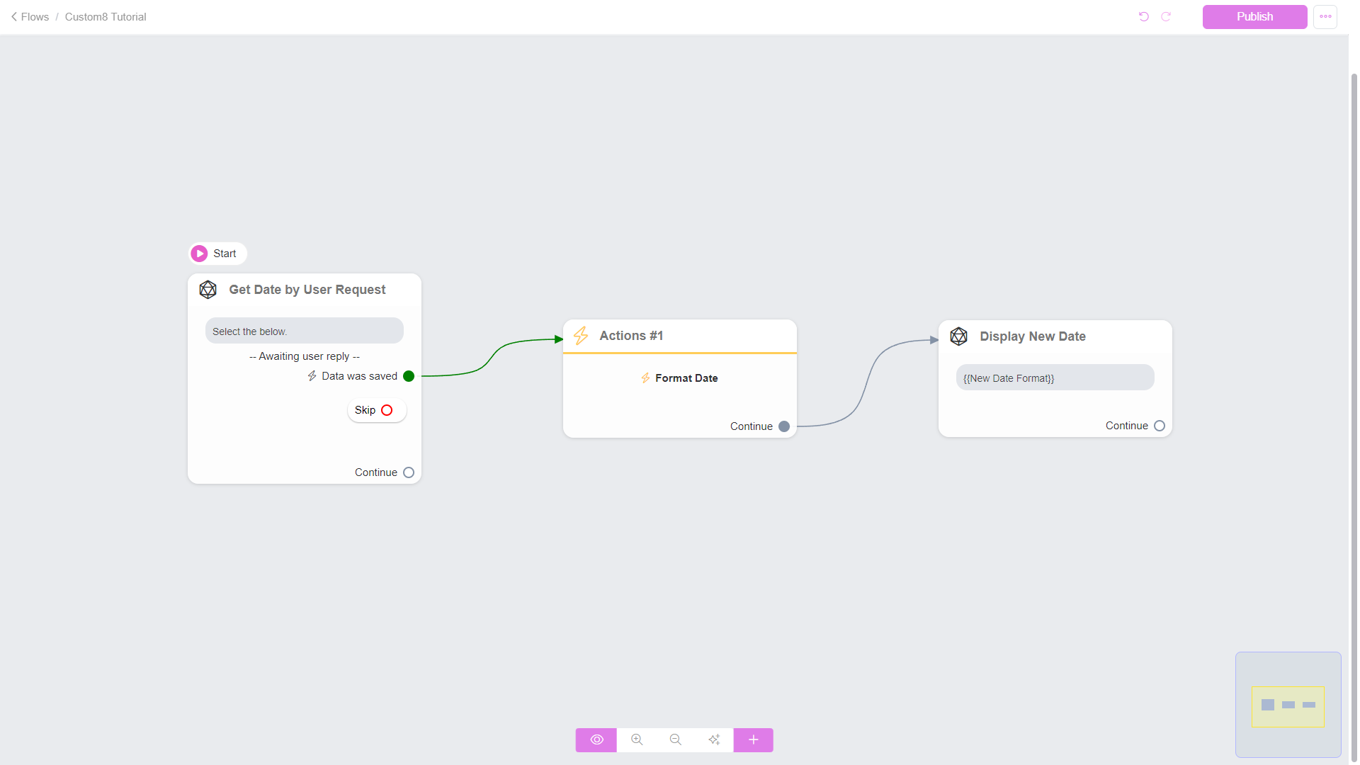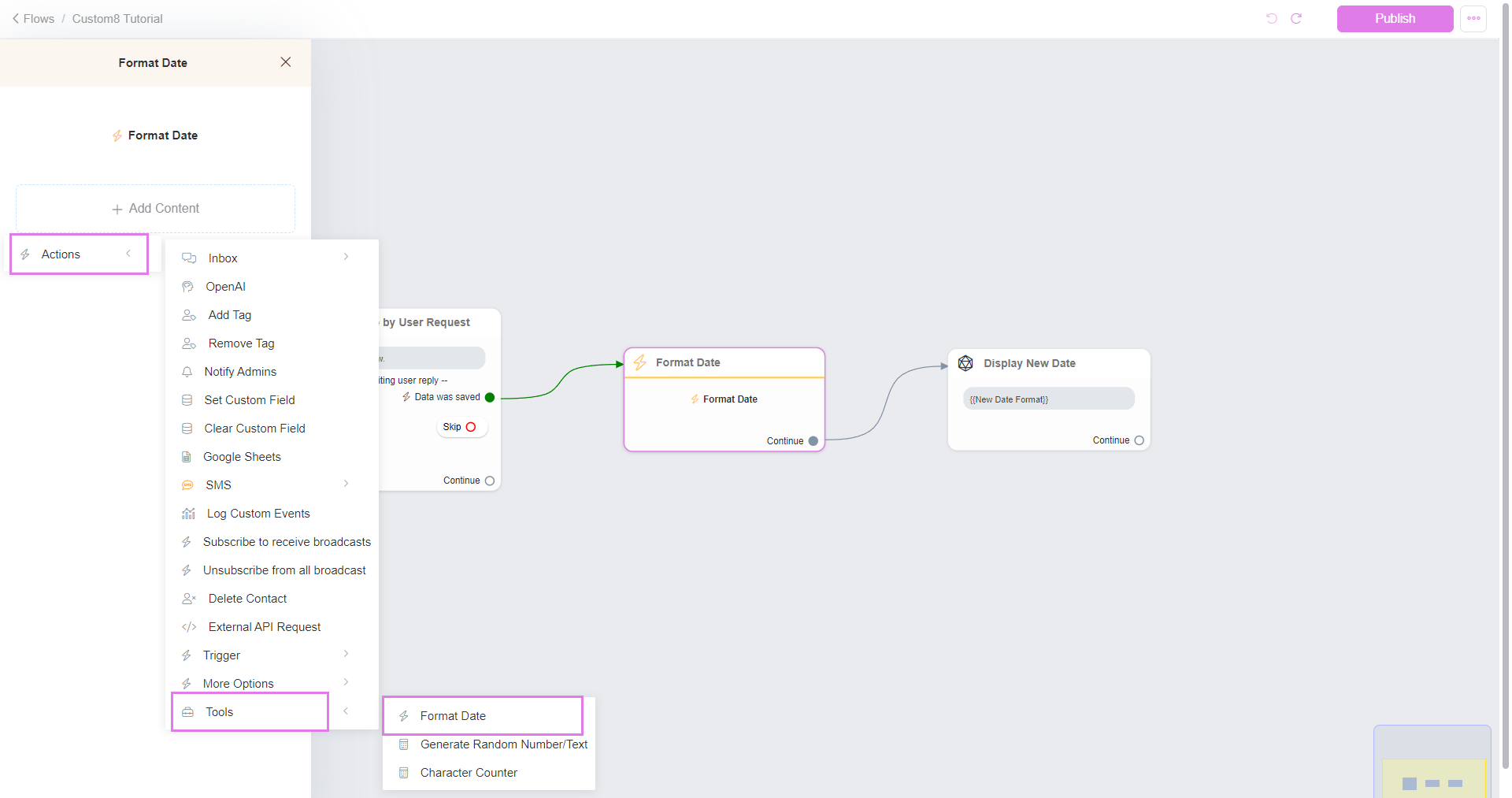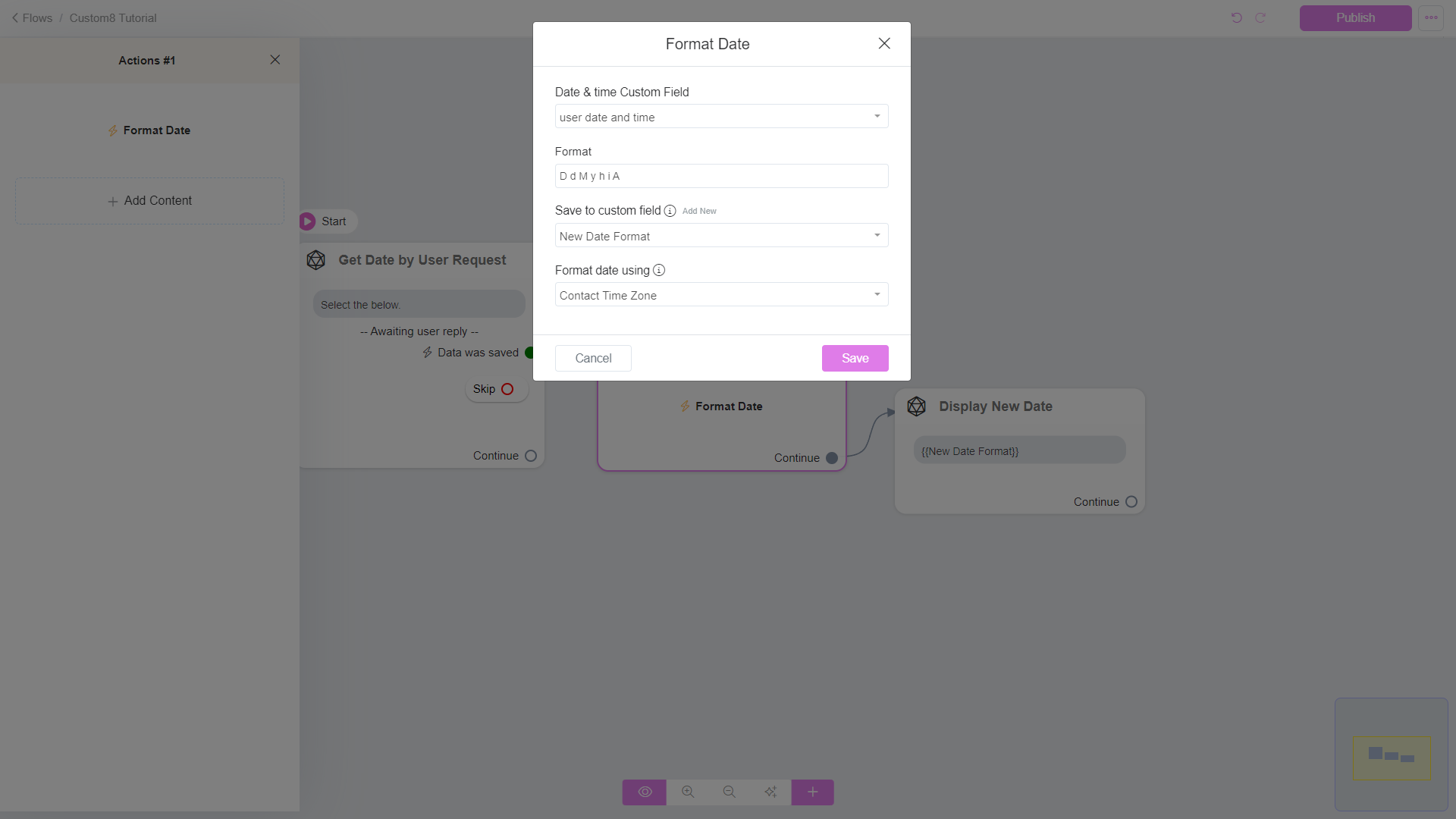 Step 2: Among many options on the builder choose the “Action” option and select “Format Date/Date & Time” on the list.