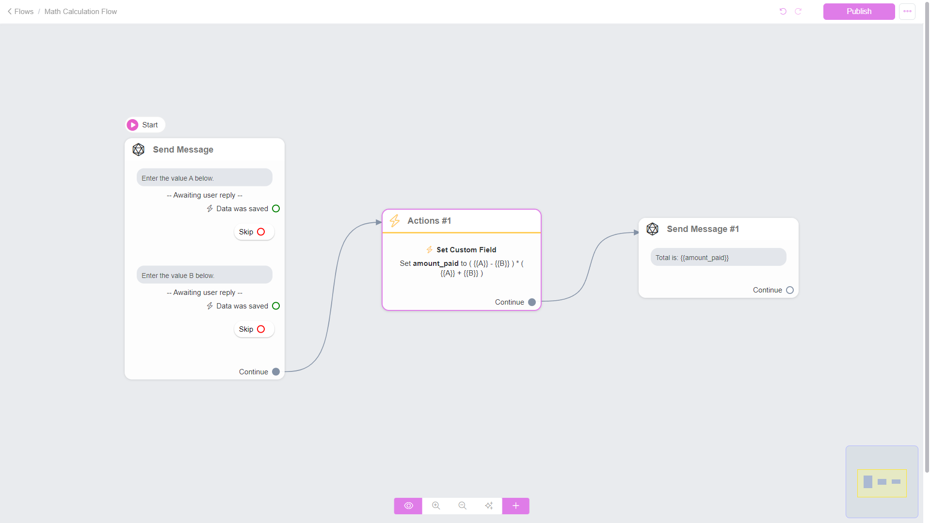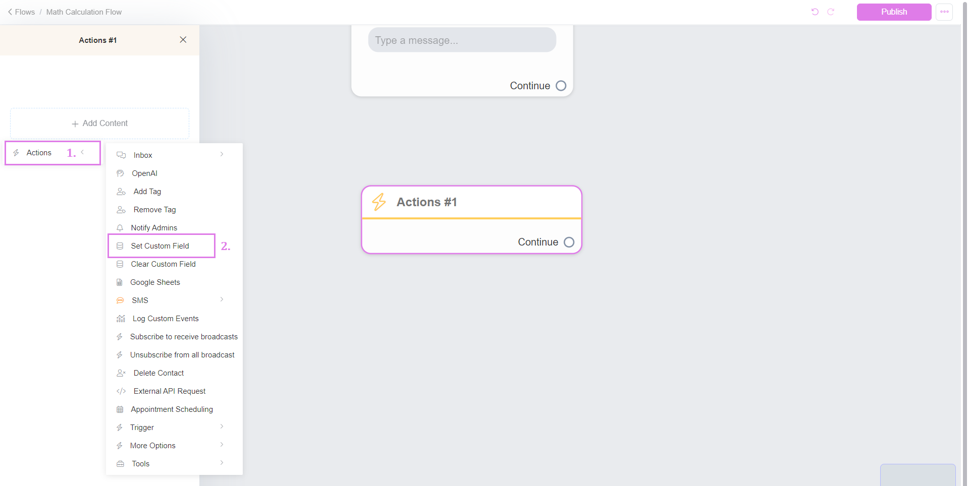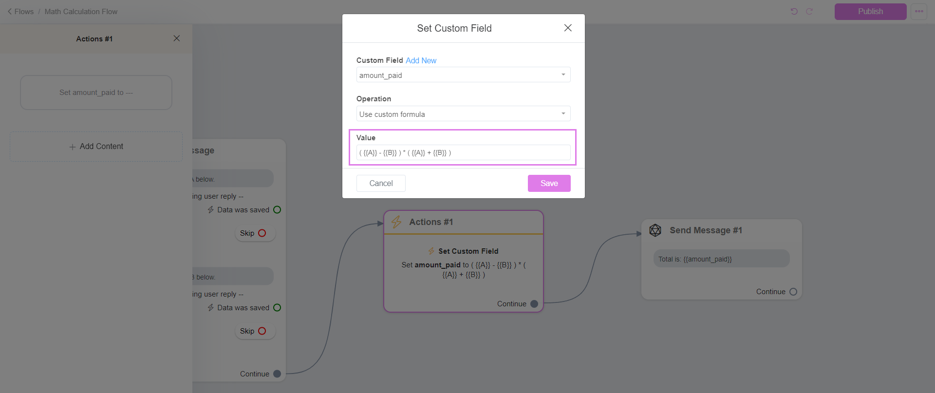 Step 3: Choose "Custom Field" in your flow. Then, select the custom field where your values are stored as numbers. Opt for a custom formula and define it in the Value field. This way, you can easily customize calculations to fit your specific needs within the chatbot flow.