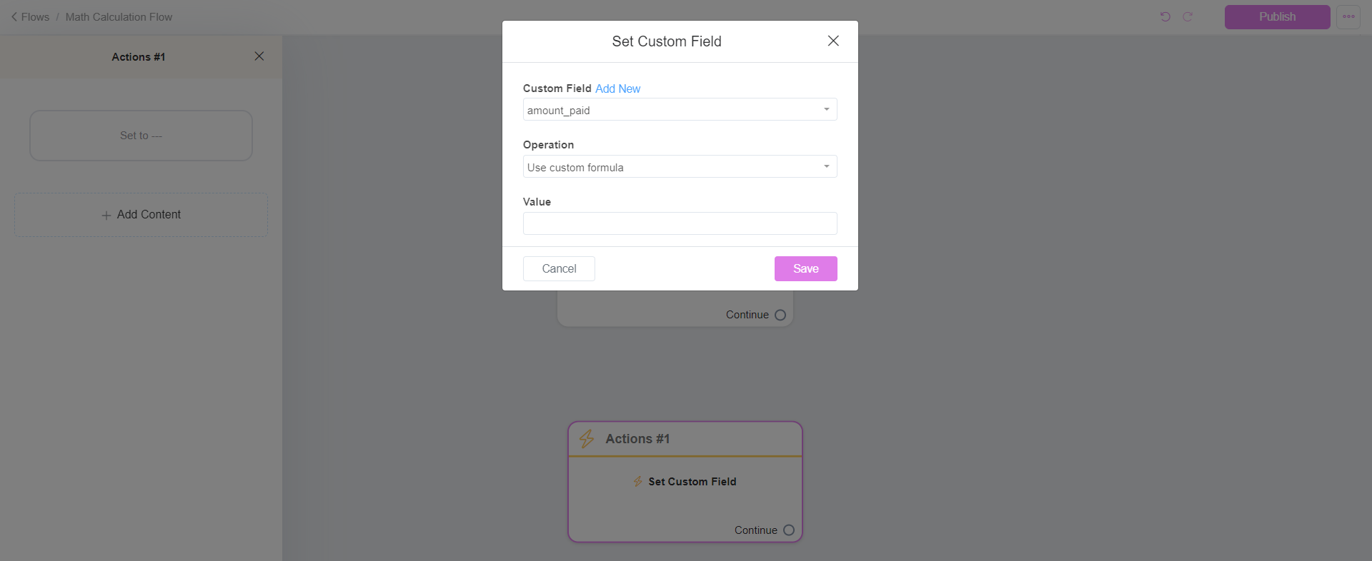 Now set the calculation formula on the flow. For that, choose action on the basic builder and select the set custom field. Then, setup the wizard by choosing the custom field (number) in which you want to store the calculated values (here, we created that as “amount_paid”).
