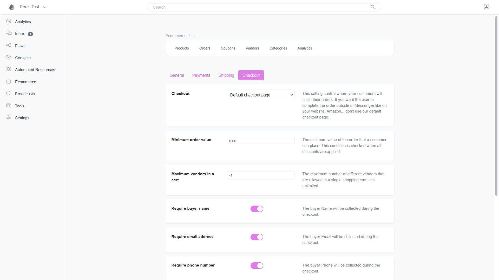 And this is what the checkout settings in the eCommerce section look like.