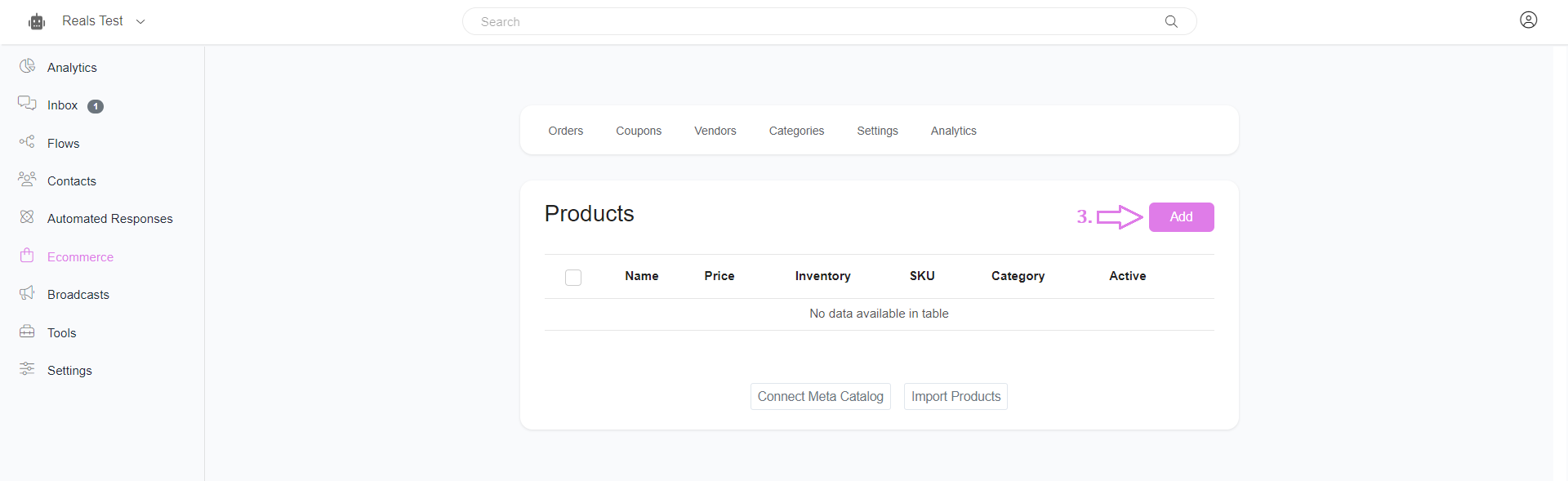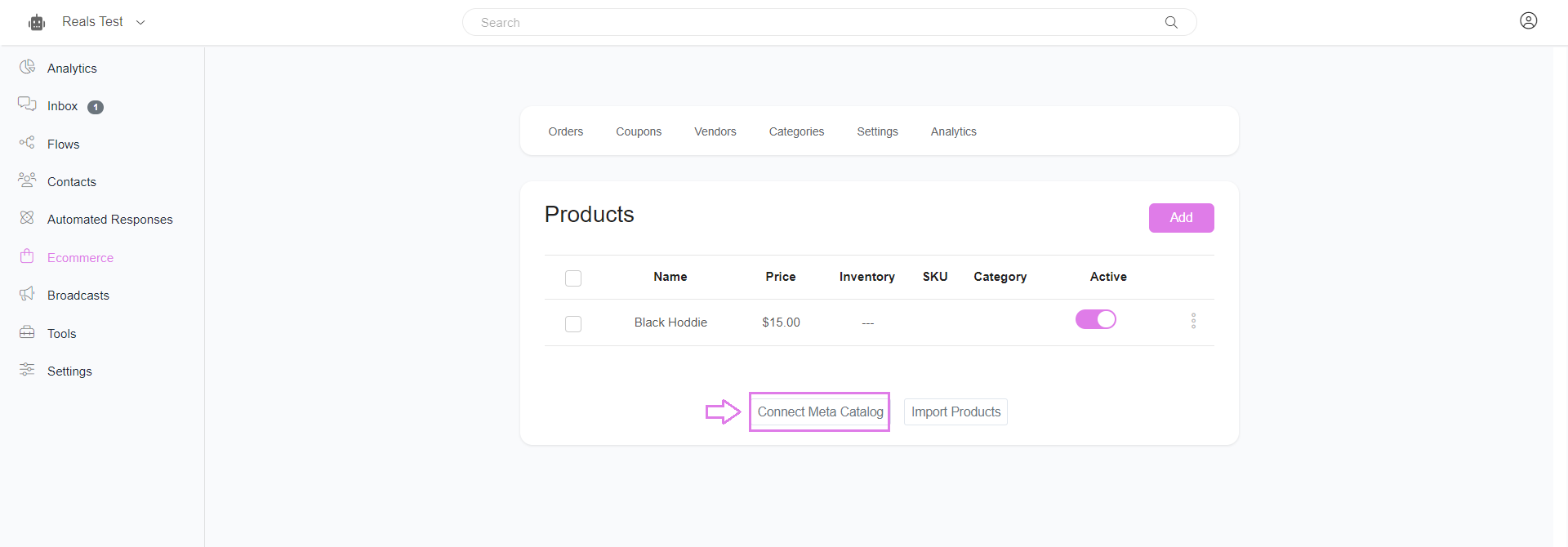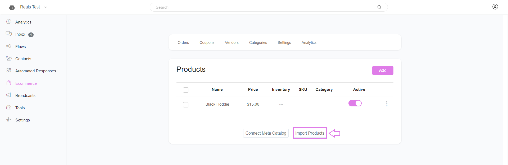 To import products from WhatsApp Catalog, you need to first follow all the steps on this documentation, then come back to your E-commerce section and click Sync Meta Catalog.