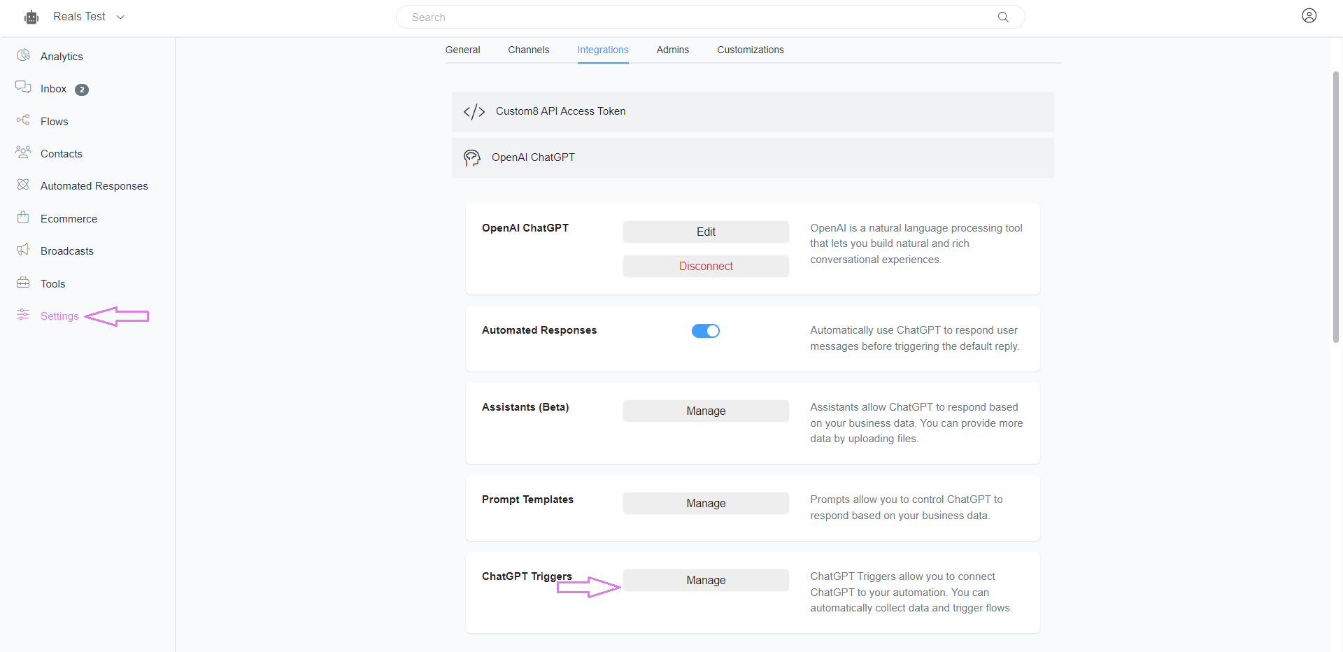 Navigate to Settings > Integrations > OpenAI ChatGPT > Functions and click the Manage button.