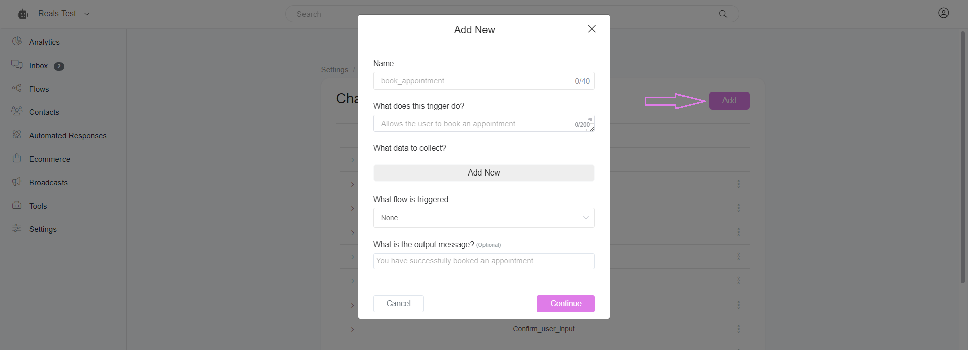 You can trigger any flow that you have already created. For the best user experience, if the response depends on the data collected, set the final response in a single custom field and use it in the "What is the output message?" below. Go to "Examples" below to see some use cases.