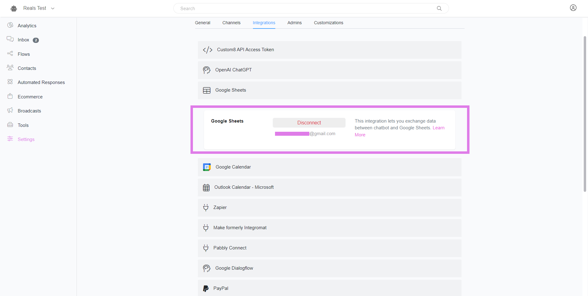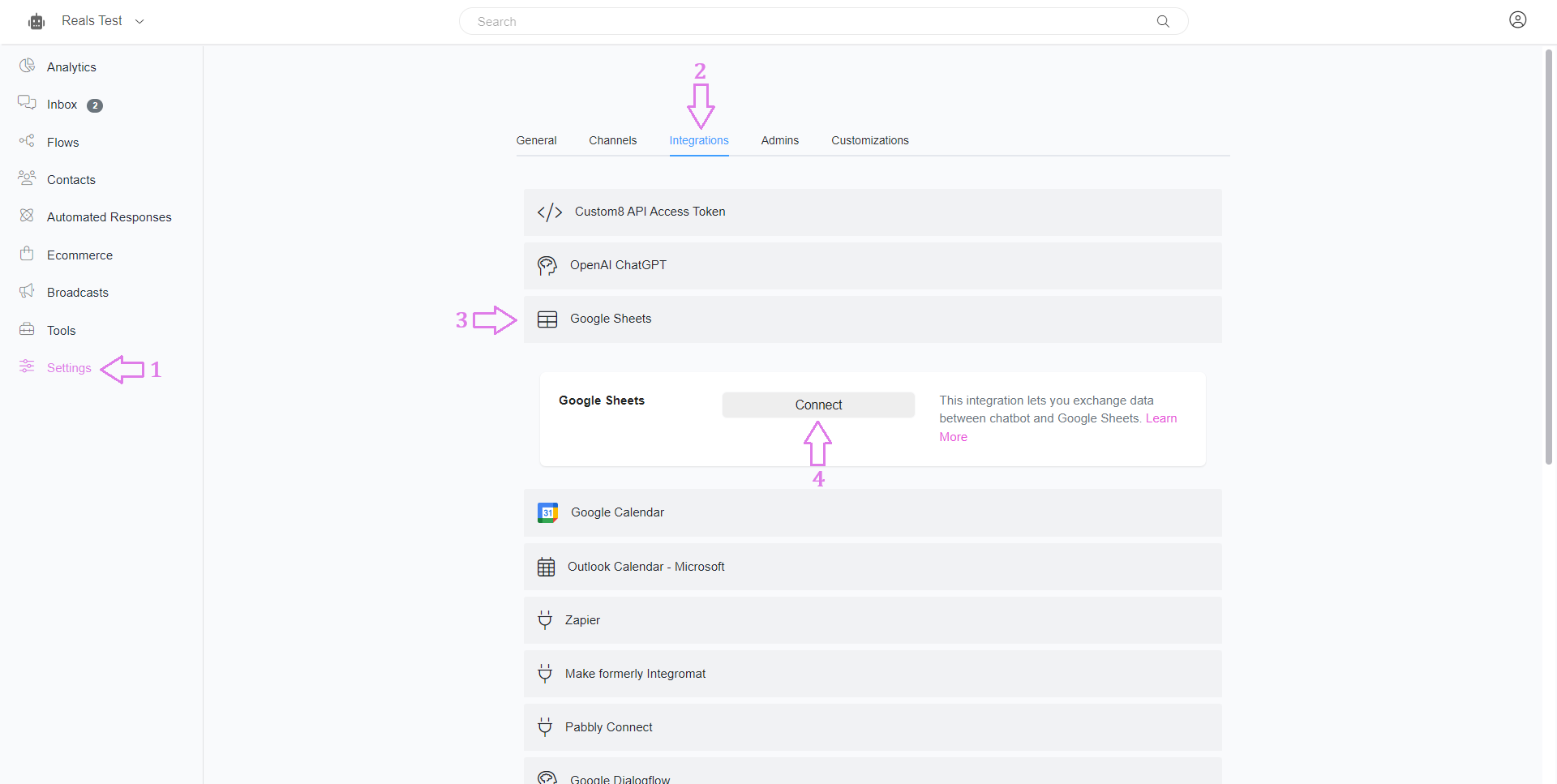 Step 3: Look for the Google Sheets Integration field and click the Connect button.
