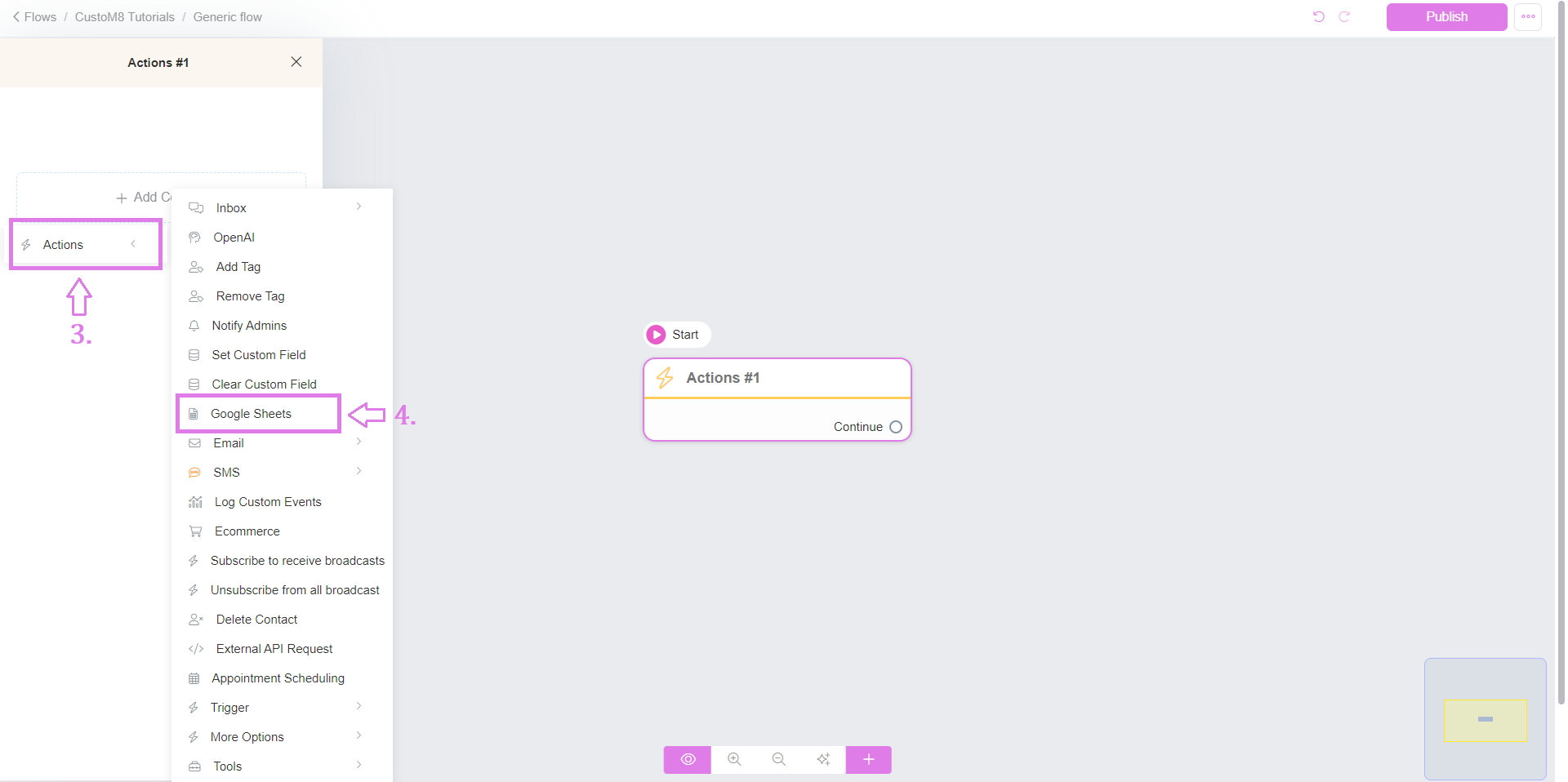 Once you reach the flow editor you can press the message block that you start with select Action > Google Sheets. Take a look below on how to find the Google Sheets integration.