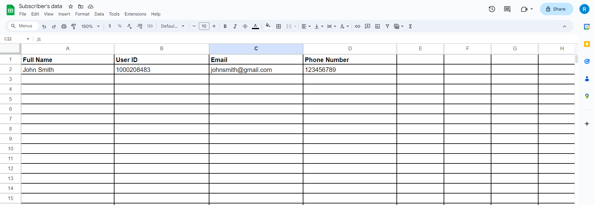 Suppose you want to gather subscriber data such as name, email, and phone number and then export it to a Google Sheet. In that case, we need to set up a few headers within the Google Sheet to organize and export the data.