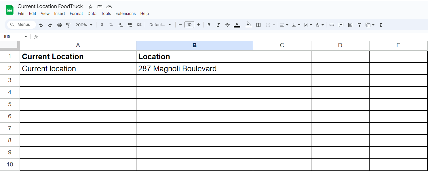 Let’s say your client has a food truck and changes location a few times a week. He wants to be able to give his current location to his customers when they ask for the location. Instead of having to update the bot every single time you can just let your client update his Google Sheet instead.
