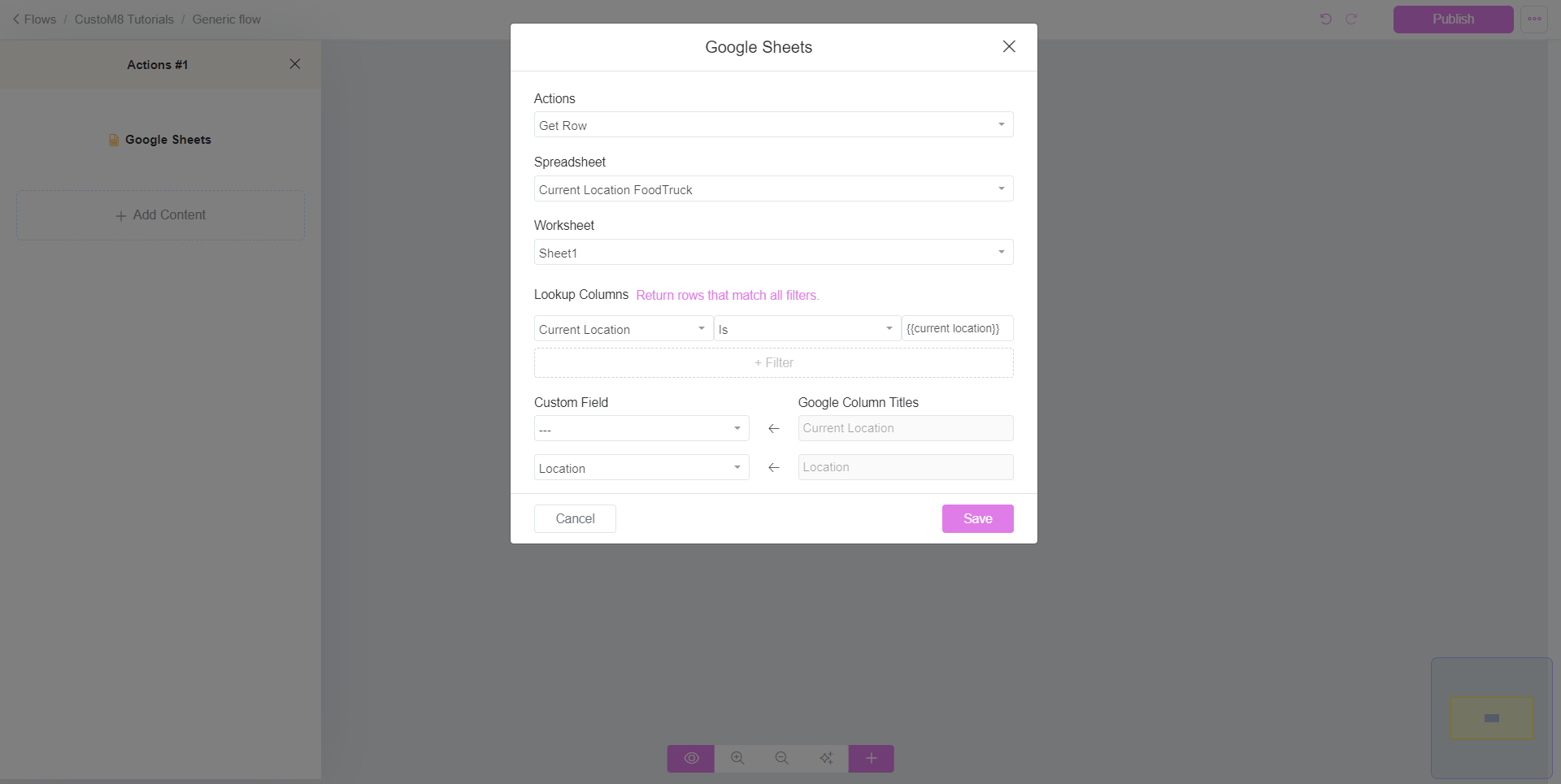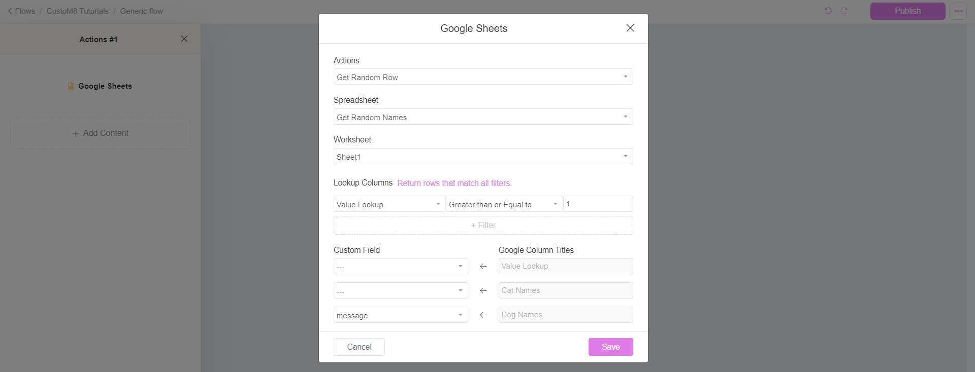 Then all you need to do inside your flow builder is to go to Google Sheets > Get Row > Select sheet > Select Worksheet > Select lookup column > Map data from sheets to bot.