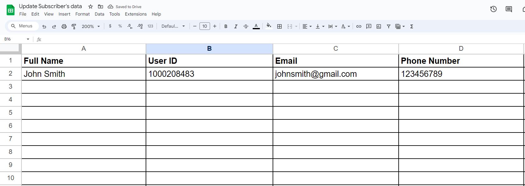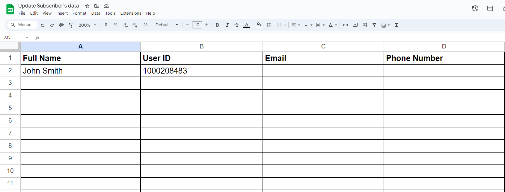 As you can see, right now we only have their Name and User ID. The User ID is crucial because it helps us find and update the subscriber's data. This column stays the same because each user ID is unique to a subscriber.