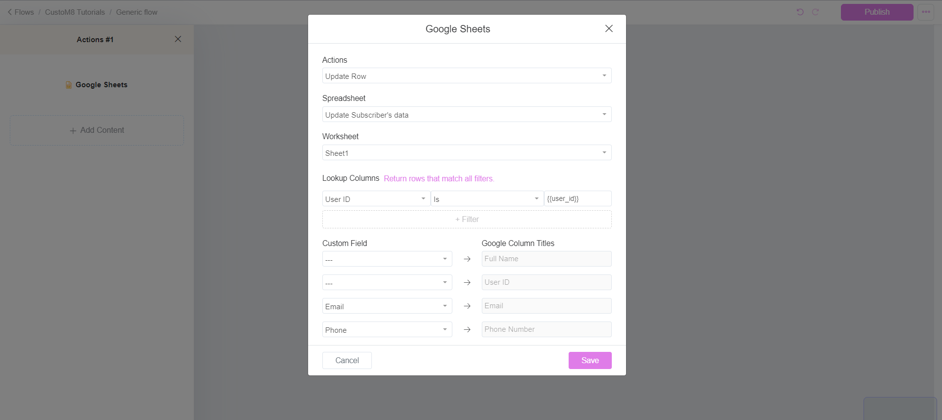 So, after you capture the additional subscriber’s data like phone number and email, we can select the Google Sheets action Update Row.