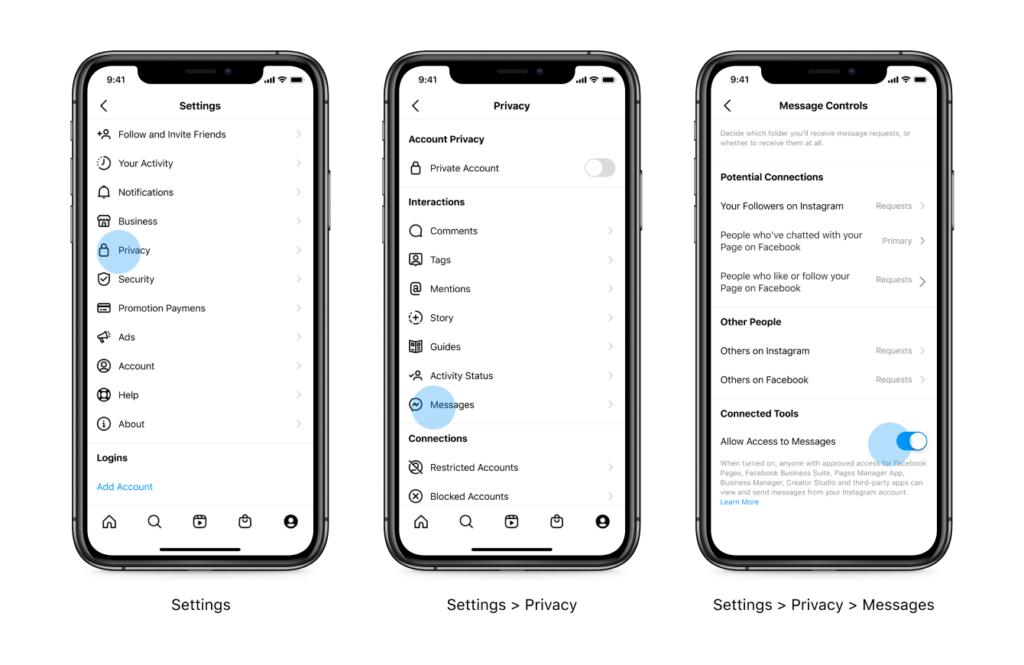 For seamless integration, Instagram Business Accounts must activate the connected tools toggle under message control settings to enable CustoM8 to manage Instagram messages effectively.