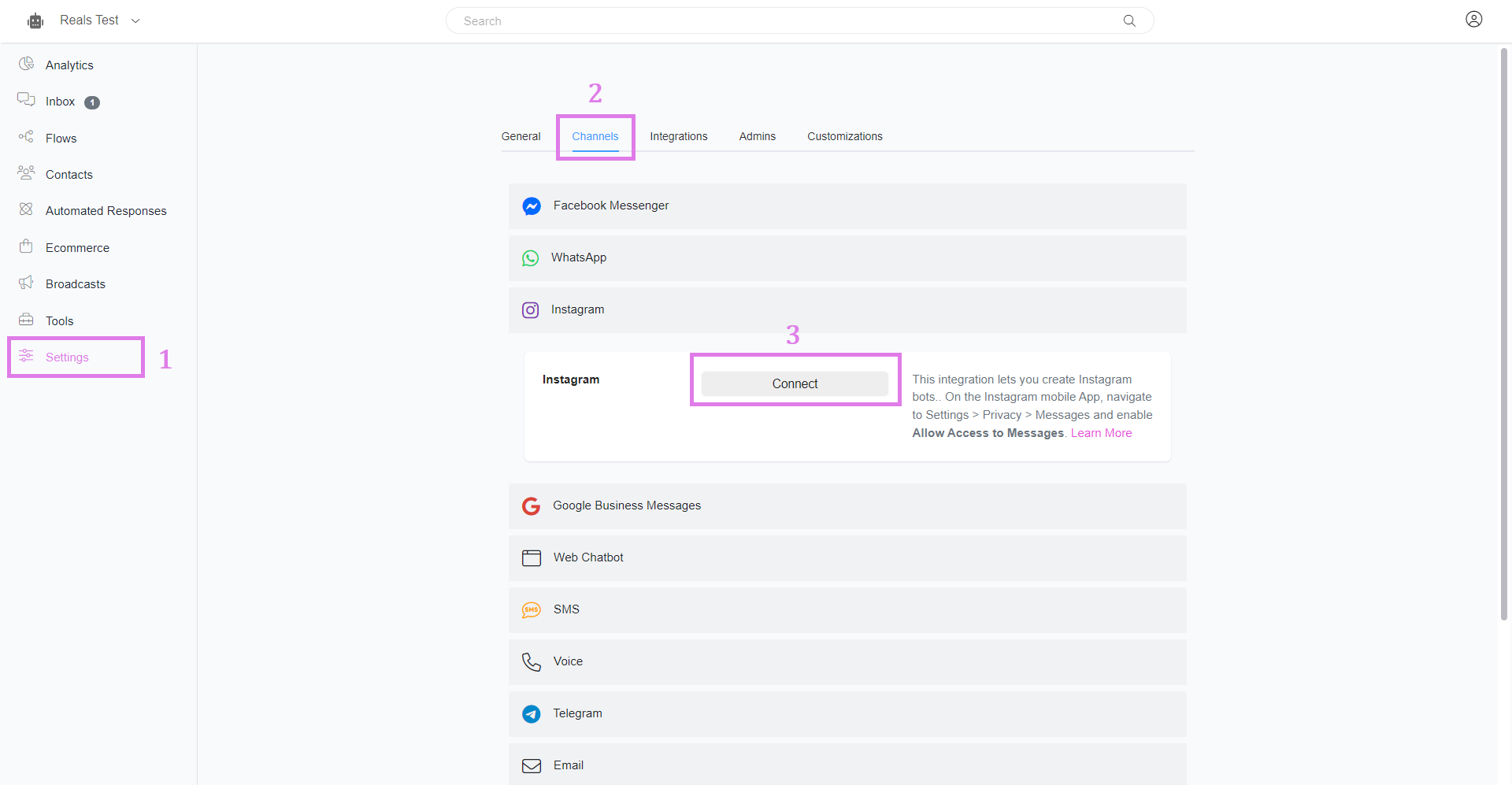 Navigate to "Settings" and select "Channels." Choose "Instagram" and click "Connect"