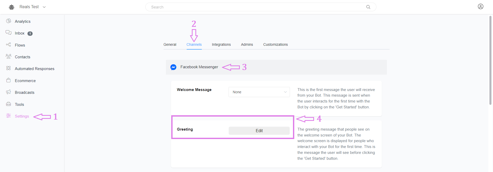 Go to Menu > Settings > Channels > Greeting. Click on Edit to customize your greeting message.