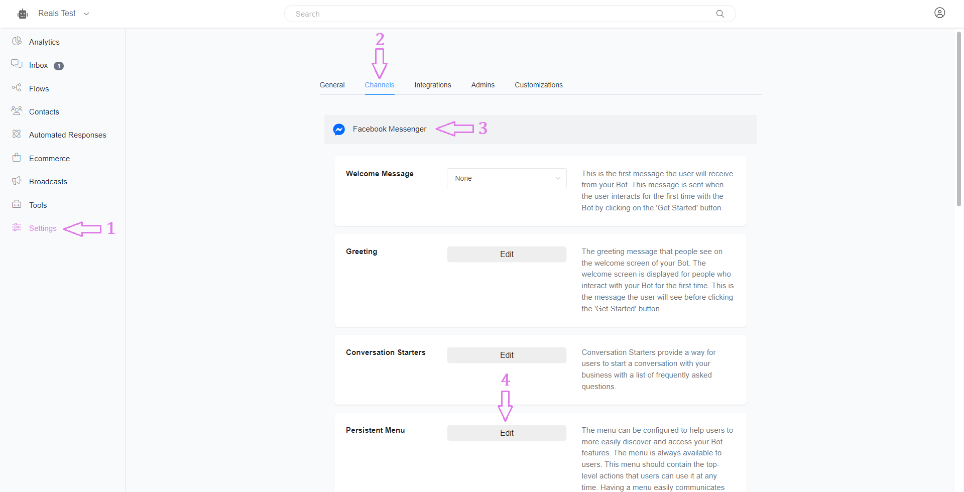 Navigate to Settings > Channels > Facebook Messenger/Instagram > Persistent Menu.