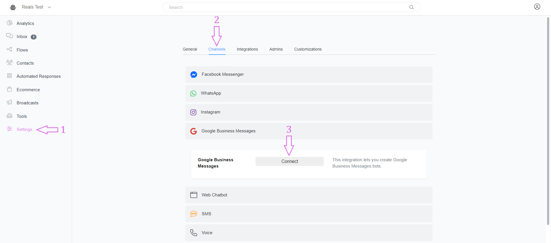 Navigate to Settings > Channels > Google Business Message and click Connect to start working with Google Business Message.