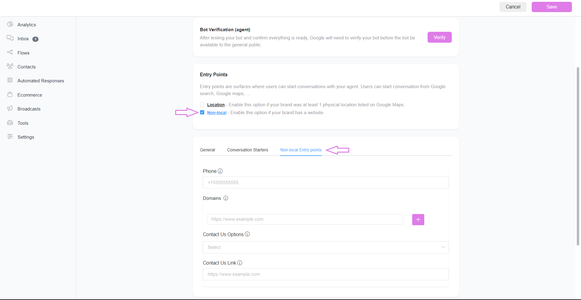 To enable Non-local entry points, you must provide your phone number and website domain.