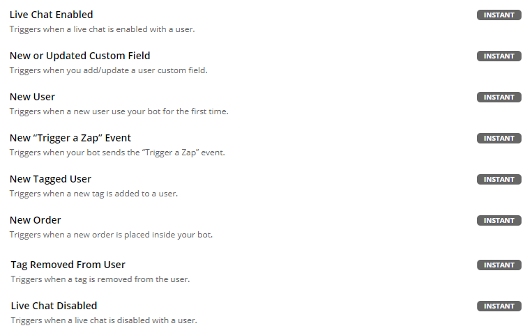 Here is a list of all available triggers enabling the transmission of data from your bot to Zapier: