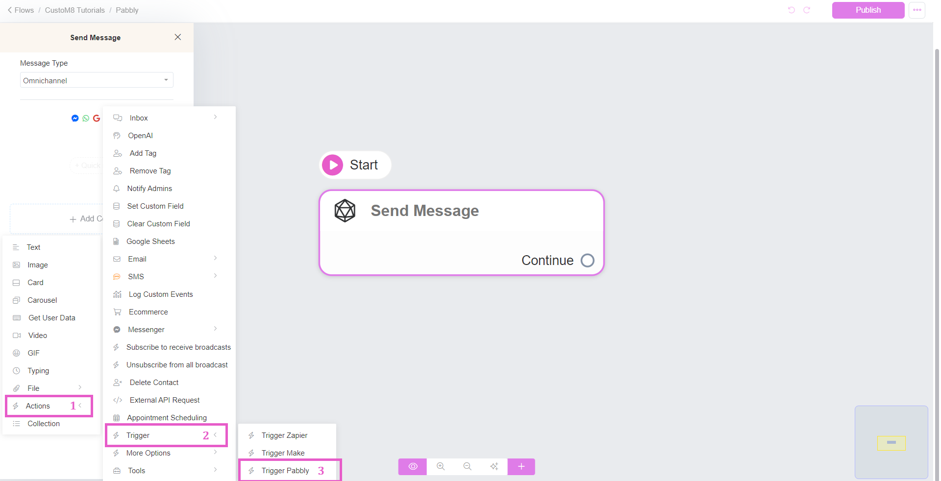 There is a special trigger that allows you to send data from your bot to Pabbly Connect at any time during your automation. Use Actions > Trigger > Trigger Pabbly action. Name your Pabbly Connect action.