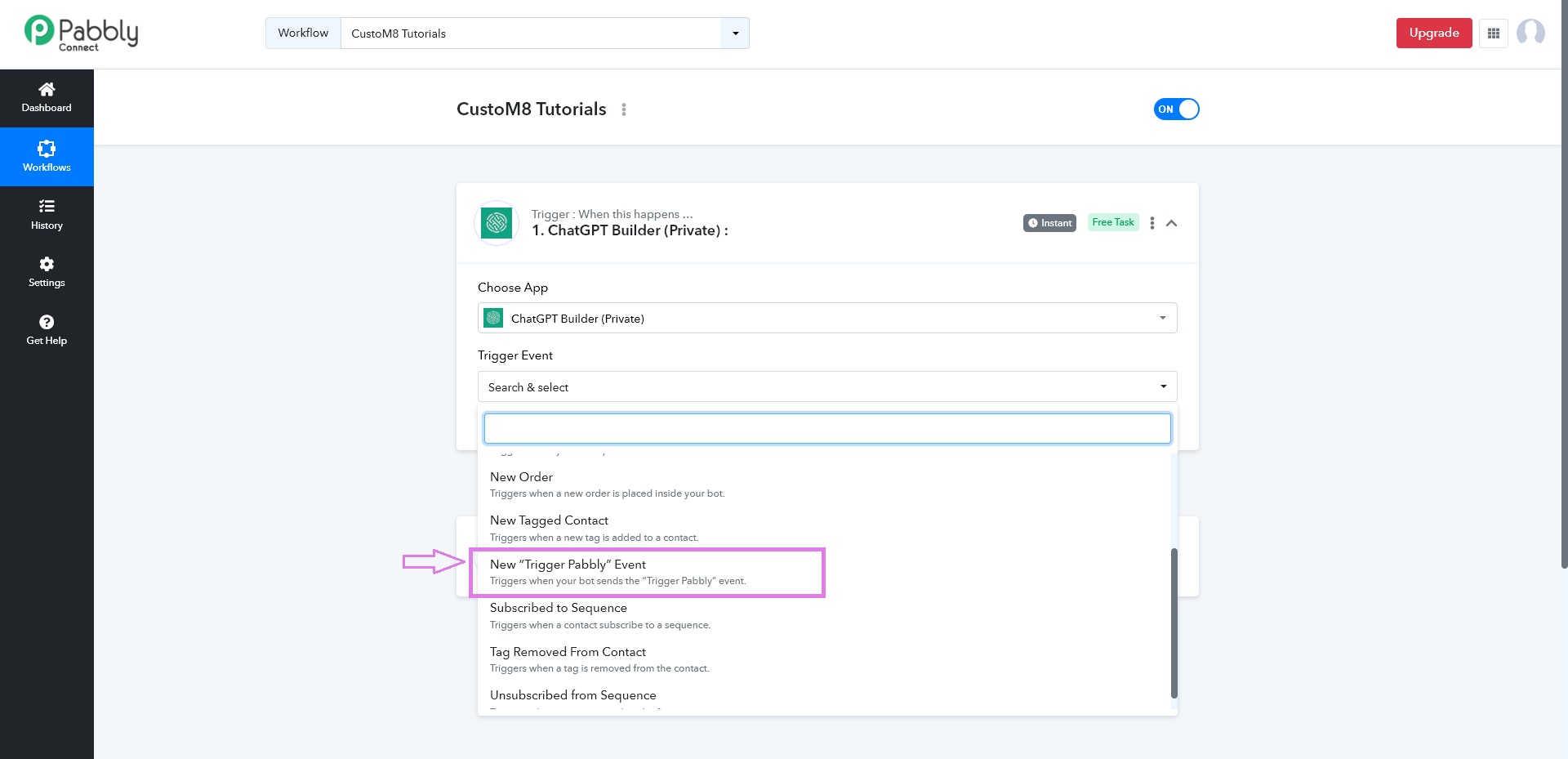 We offer numerous triggers that enable you to effortlessly send data from your bot to Pabbly Connect. Whether it's automatically sending contact data when a tag is applied, when a custom field value changes, or when a conversation is transferred between a human and a bot, our triggers cater to various scenarios. For a comprehensive list of triggers, please refer to the Pabbly Connect documentation.