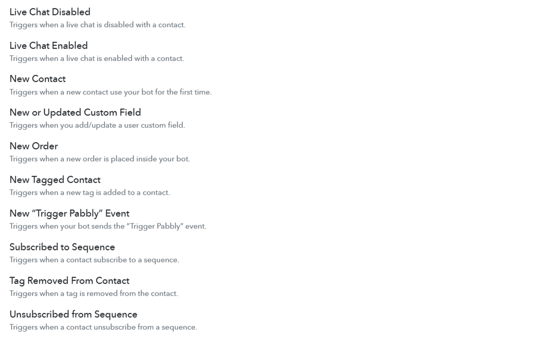 Below are triggers available that allow you to send data from your bot to Pabbly Connect.